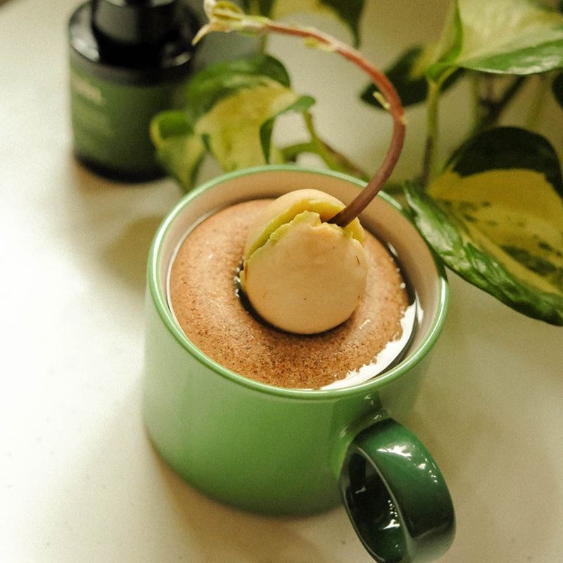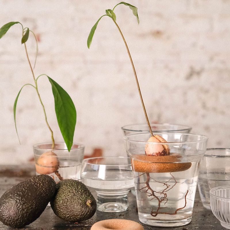 Der Kork-Bojenring eignet sich optimal zum Anzüchten von Avocadopflanzen. Du kannst entweder eine kleine Wurzel vorziehen oder den geschälten Kern direkt auf den Ring in einen mit Wasser gefüllten Behälter setzen. Bereits nach wenigen Wochen werden sich Wurzeln und der Trieb ausbilden. Das Verpackungsdesign ist von Gigi gestaltet worden.