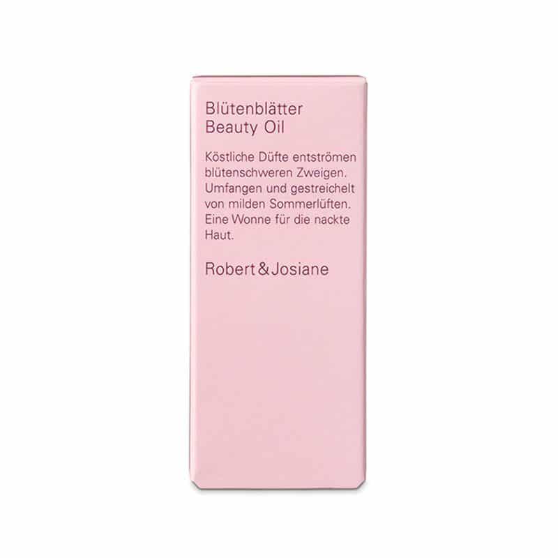 Kostbare Essenzen aus Rose, Neroli und Jasmin im Schönheitsöl verleihen eine glatte und blütenzarte Haut. Wirkt aphrodisierend und stimmt optimistisch. Für alle Hauttypen geeignet. Im „Blütenblätter“ wirkt die Komposition ausgesuchter Öle, die schnell eindringen und sich auf der Haut seidig anfühlen. Sonnenblumenöl ist ein hervorragendes Hautöl, das gegen die freien Radikale wirkt, Jojobaöl hilft der Haut, Feuchtigkeit zu speichern, Distelöl zieht rasch ein und eignet sich für die sensible Haut.