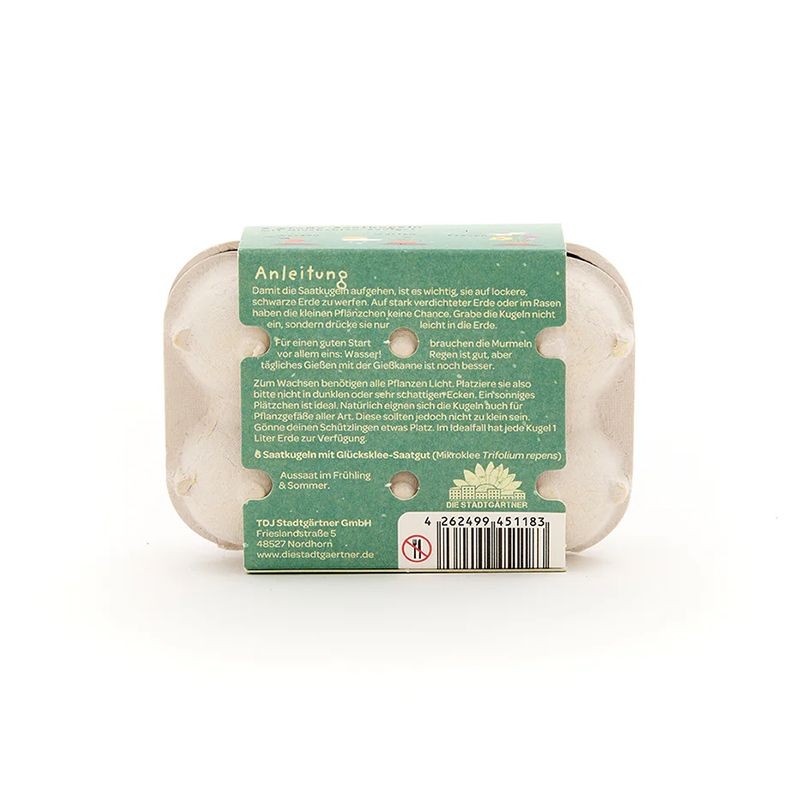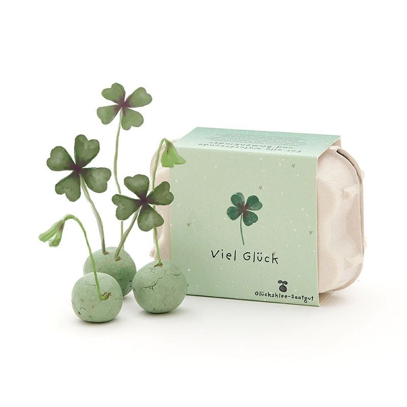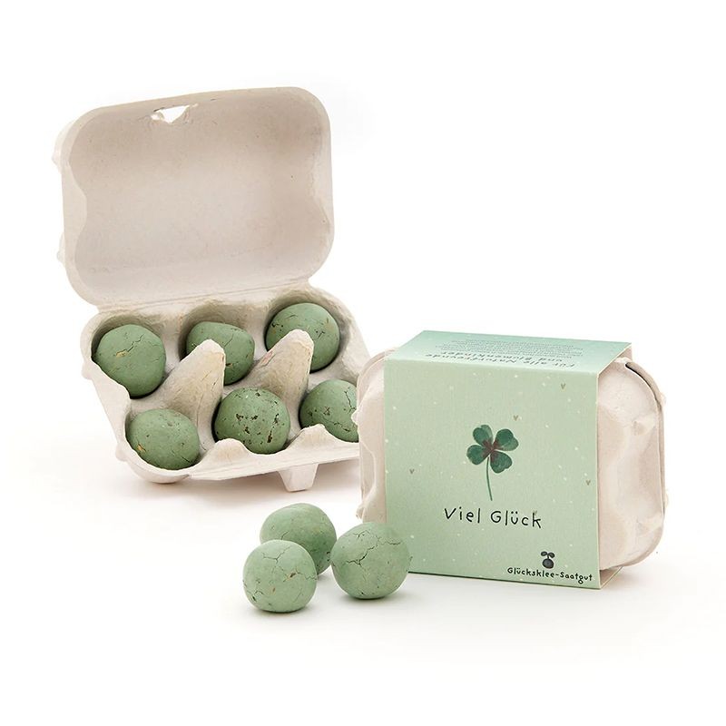 Die 6 grünen Blumenmurmeln im Mini-Eierkarton enthalten Glücksklee-Saatgut – eine originelle Geschenkidee für alle, denen man Glück wünschen möchte. Einfach einpflanzen, giessen und freuen: Aus den Samenbomben wächst dekorativer Glücksklee heran – perfekt für Balkon, Garten oder Blumentopf. Mit diesem Glücksbringer kann der Beschenkte das Glück im wahrsten Sinne des Wortes wachsen lassen. Eine besondere und nachhaltige Geschenkidee, um jemandem “viel Gück” zu wünschen.