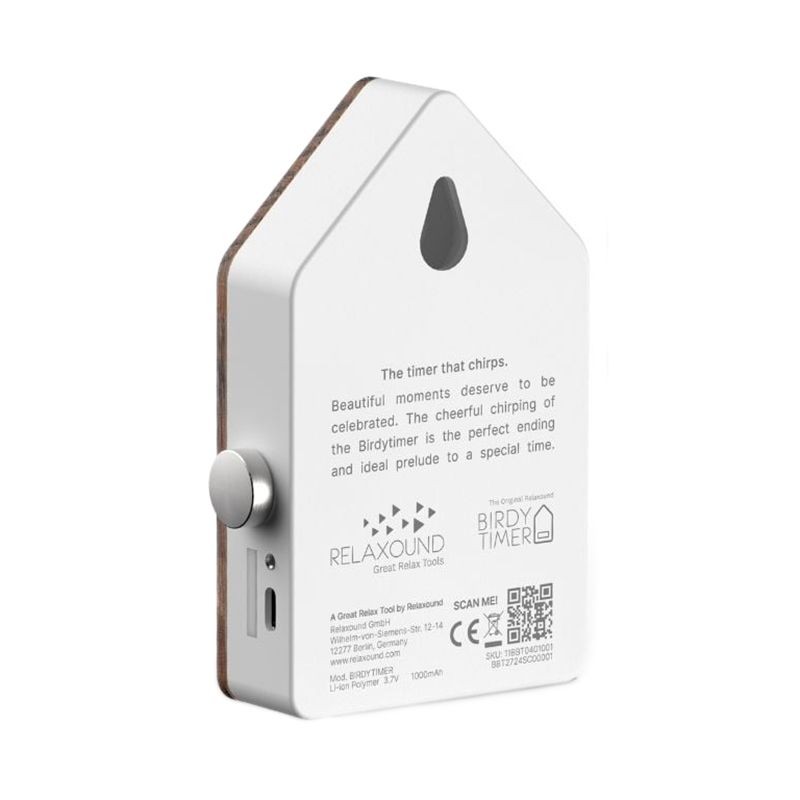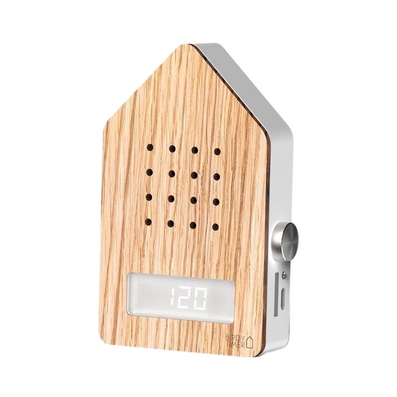 Der Birdytimer macht es leicht eine gute Zeit zu haben: Er zwitschert, wenn die Wunschzeit erreicht ist. Dabei sieht er auch noch gut aus, die edle Designfront aus 100% Eichenholz wird in einer Thüringer Holzmanufaktur von Hand veredelt, um ein edles Finish zu erreichen. Das Vogelhaus-Design ist ein Klassiker, der perfekt zum Sound passt. Mit der Easy-Crown an der Seite rechts stellst du deine Wunschzeit ein. Einmal drücken: Zeit durch Drehen einstellen. Noch einmal drücken: Fertig! Deine Wunschzeit ist aktiviert. Die Ziffern zeigen die Minuten, in der letzten Minute zeigen sie dir die Sekunden. Dank nachhaltigem Akku hast du reichlich Energie, wenn du eine gute Zeit geniesst.