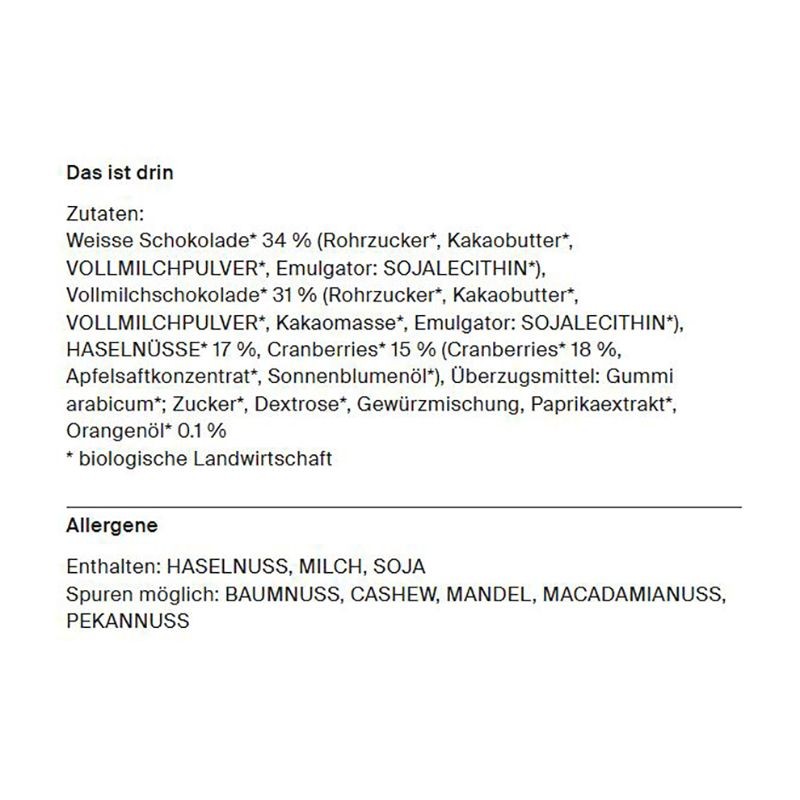 Knackige Haselnüsse und Cranberries werden mit feinsten Schichten von Orangen- und Zartbitterschokolade überzogen. Orangenduft und Lebkuchengewürz machen daraus einen sinnlichen Weihnachtsgenuss, wie aus Kindertagen.