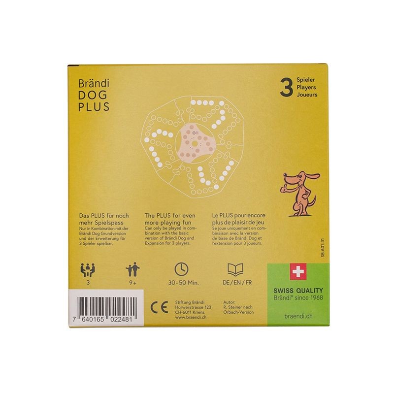Mit dem Brändi Dog Plus wird der Klassiker Brändi Dog noch spannender, noch taktischer und noch variantenreicher. Die Ergänzung bringt einen neuen Charakter ins Spiel ohne das bewährte Spielprinzip zu verändern. Es entstehen Abkürzungen und fiese Chancen seine Gegner heimzuschicken. Das Plus-Spielfeld darf nur von einer bestimmten Position aus betreten werden. Das Holzelement besteht aus dem gleichen Holz wie das Brändi Dog. Nur in Kombination mit dem Brändi Dog 4er oder 6er und der Erweiterung für 3 Spielende spielbar.