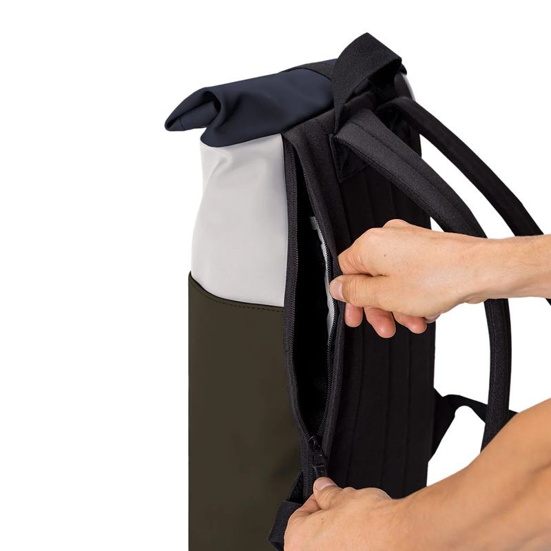 Die Lotus Infinity Rucksäcke werden aus “PUrTEX8” hergestellt – einem speziellen, ultra-haltbaren technischen Material, das Ucon Acrobatics über mehrere Jahre hinweg entwickelt hat. Es wird aus recycelten Textilabfällen hergestellt und mit einer festen Beschichtung aus lösungsmittelfreiem Polyurethan (PU) versehen. Der Roll-top schliesst mit Klettverschluss und ermöglicht ein praktisches Befüllen des Hajo Backpacks. Qualitativ hochwertiges Neoprenlaptopfach (bis 16.4“) mit zwei aufgesetzten Meshtaschen für Telefon und Geldbeutel. Die fluorcarbonfreie PU-Aussenbeschichtung macht das Material wasserdicht. Zusätzlicher Flaschenhalter und Schlüsselanhänger innenliegend. Verstärkte Rückseite mit Polsterung für mehr Komfort.
