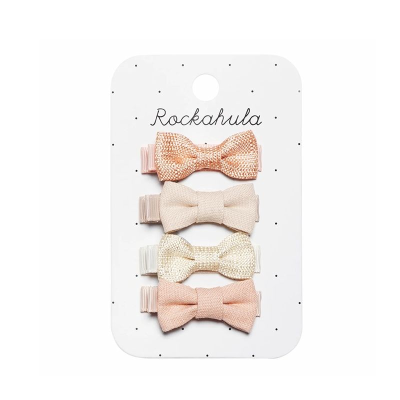 Diese hübschen Haarspangen aus Leinen in zarten Rosatönen sind auf Tragekomfort ausgelegt. Jede Spange ist mit vier kleinen, handgebundenen Stoffschleifen verziert und mit einem weichen Ripsband umwickelt. Achtung: Enthält Kleinteile, nicht geeignet für Kinder unter 36 Monaten.