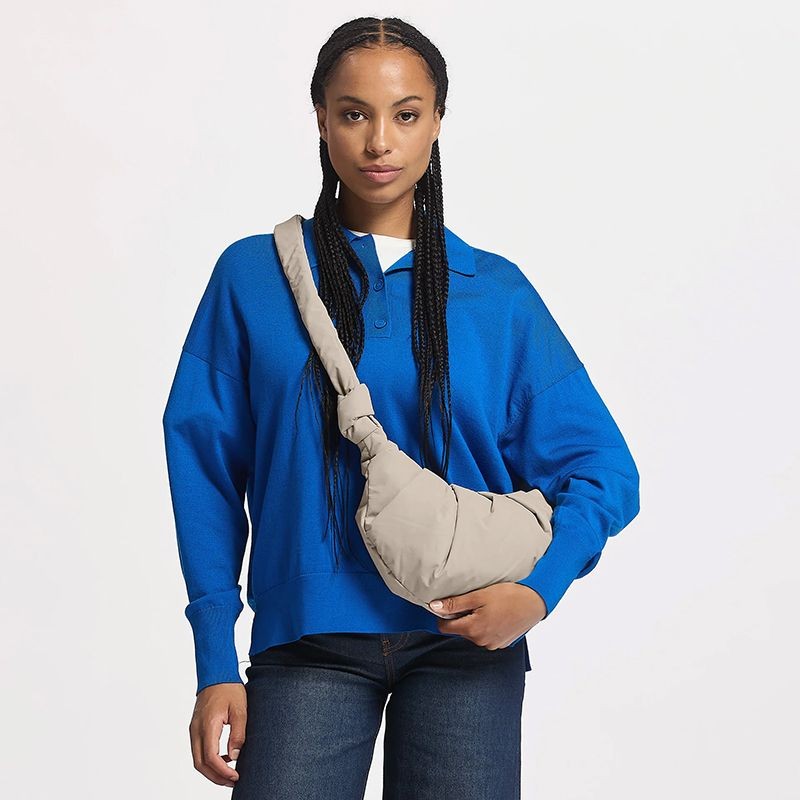 Superweich, verspielt und wasserabweisend: Dieses 3-Liter-Raumwunder mit Knoten-Detail wirst du lieben – to the moon and back. RE:NYNET® Hauptmaterial aus recycelten Fischernetzen, Innenfutter und Reissverschluss aus recyceltem Nylon, Reissverschluss innen aus recyceltem Polyamid, Gurte aus RE:NYNET®, Polsterung aus recyceltem Polyester. Das Material ist wasserabweisend, wodurch die Tasche auch bei leichtem Regen getragen werden kann.