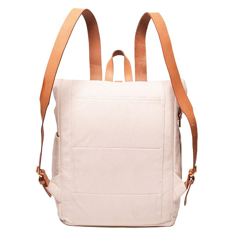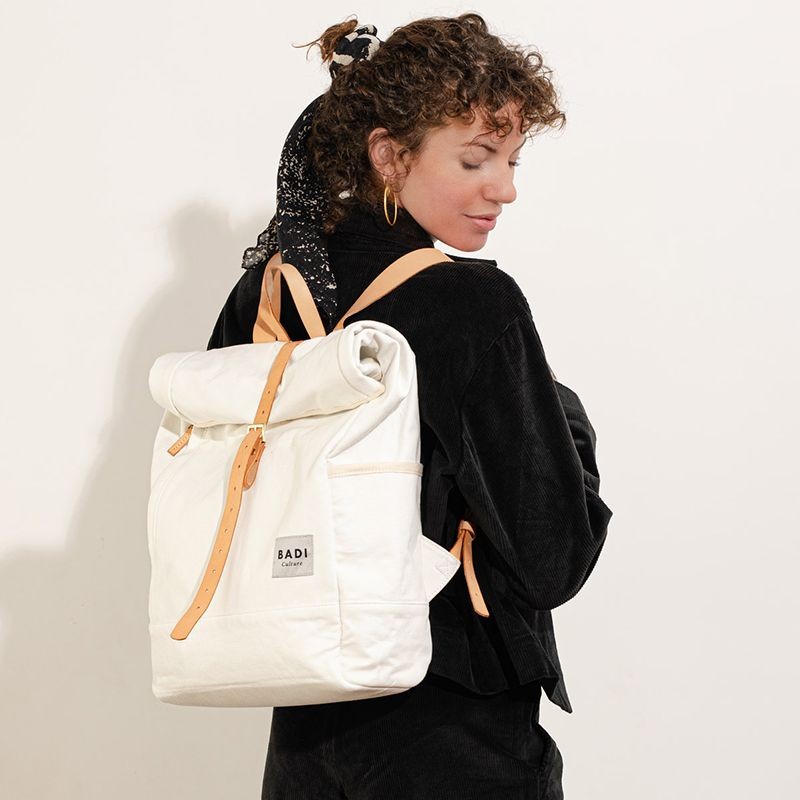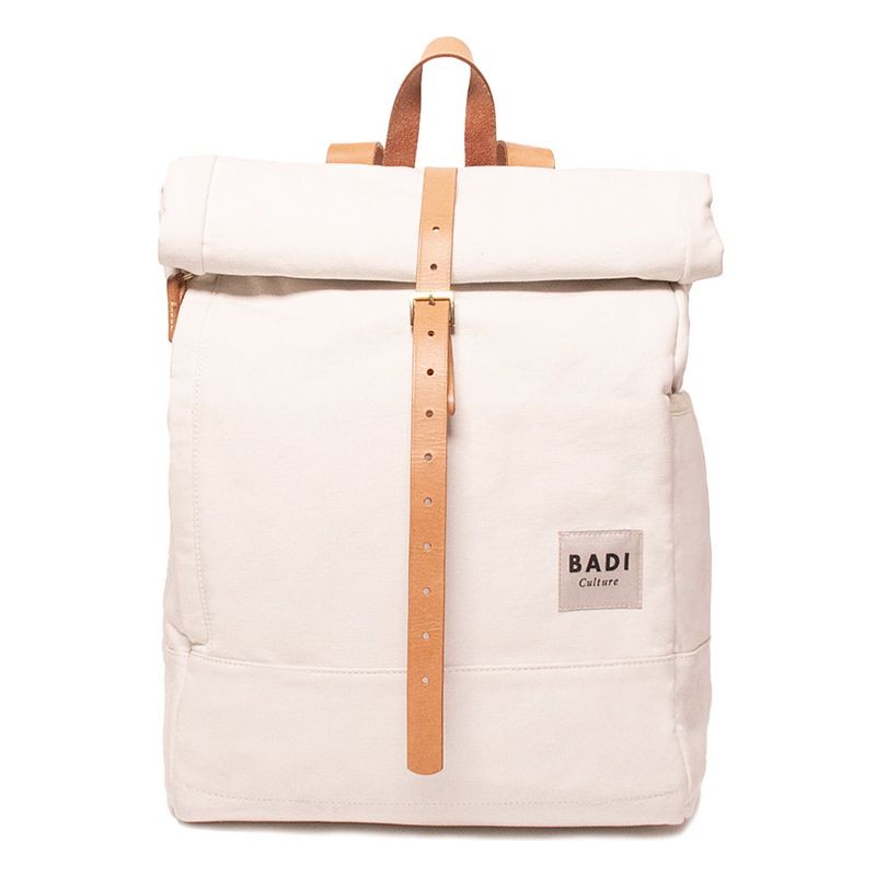 Der praktische und durchdachte Roll-Over Rucksack überzeugt durch seine Einfachheit und Ästhetik. Er besteht aus Bio-Baumwolle mit einer wasserabweisenden Beschichtung sowie Veg-tan Leder aus Portugal und Spanien. Der Rucksack hat ein äusseres Flaschen-Fach (auch für einen Regenschirm geeignet), ein unterteiltes Aussenfach mit Reissverschluss (ideal für Portemonnaie, Brille und Schlüssel) und einen seitlichen Zugang zum Inneren. Der Riemen dient nicht nur als Verschluss, sondert er eignet sich auch sensationell um eine Jacke oder ein Badetuch anzuschnallen. Im Inneren gibt es ein Laptopfach (ideal für 15-Zoll Laptops – auch Grössere möglich) und ein “Geheimfach”.