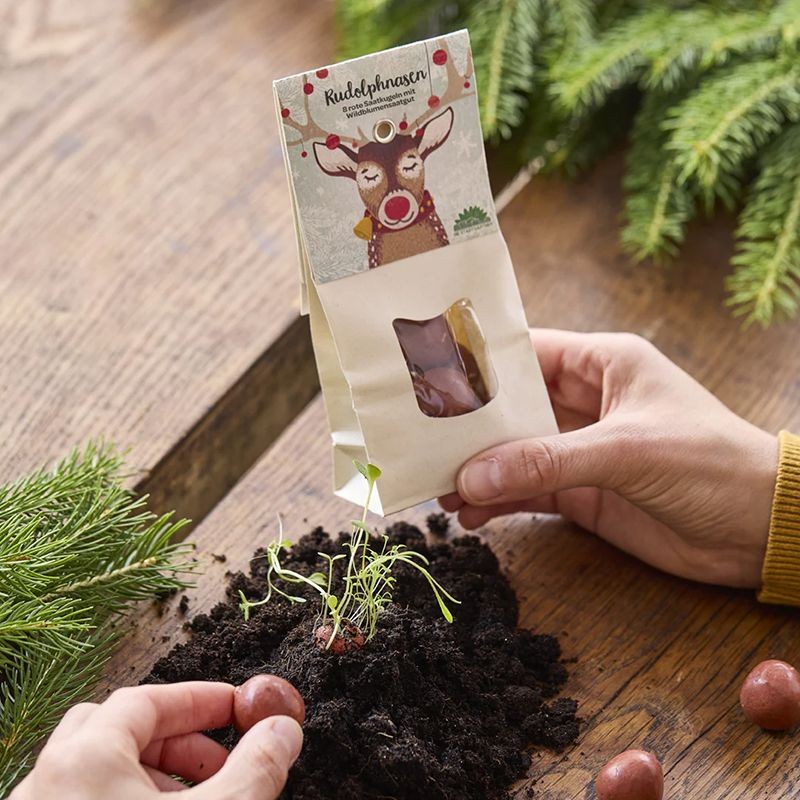 Die roten Blumenmurmeln leuchten rot wie die Nase des berühmten Rentiers. Sie sorgen schon an Weihnachten für Vorfreude auf die nächste Gartensaison. Die Rudolphnasen enthalten 19 verschiedene Sorten von Wildblumensaatgut und sorgen für eine bunte Blumenwiese im Garten. So geht’s: Für blühende Ergebnisse wirf die Samenbomben auf lockere Erde und drücke sie leicht an (nicht einbuddeln). Halte sie besonders am Anfang immer schön feucht.