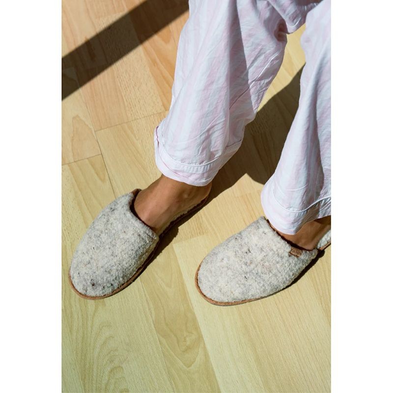 Die Hausschuhe werden in Handarbeit in Portugal hergestellt. Dank der verwendeten Schurwolle aus Ardèche und dem Innenfutter aus Bio-Baumwolle sind die Schuhe warm und bequem. Ausserdem sind die Sohlen rutschfest.
