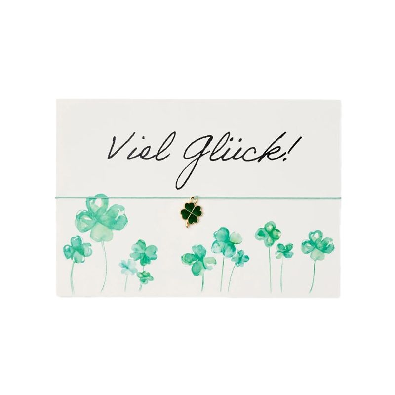 Manchmal braucht es nur ein paar Worte, aber ohne ein Kleeblatt geht es nicht! Karte mit einem Glückskleeblatt als 18 Karat vergoldeter Anhänger an einem hellgrünen Armband. Jede Karte wird von by Vivi. mit viel Herz und aufwendig erstellt. Ergänzt werden die detaillierten Zeichnungen mit einem farbigen Band und einem auf das Design abgestimmten Anhänger.